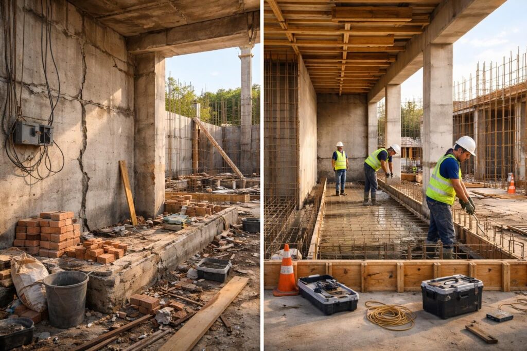 Une fois les dommages évalués, des travaux de réparation doivent être planifiés et exécutés correctement. Cela peut inclure la reprise de travaux mal réalisés, des renforcements structurels ou même la réfection complète de certaines zones. L’important est d’agir dans les meilleures conditions pour éviter d’aggraver la situation initiale.